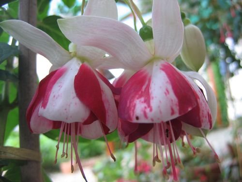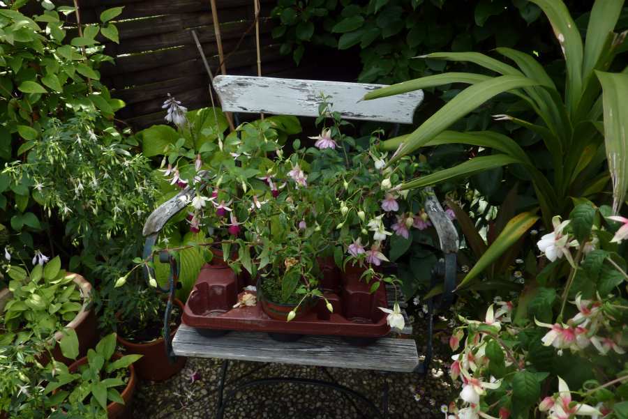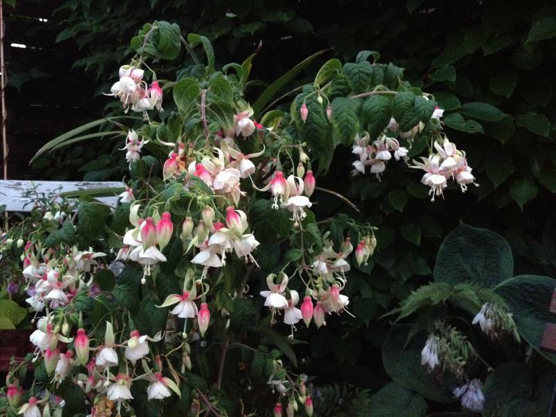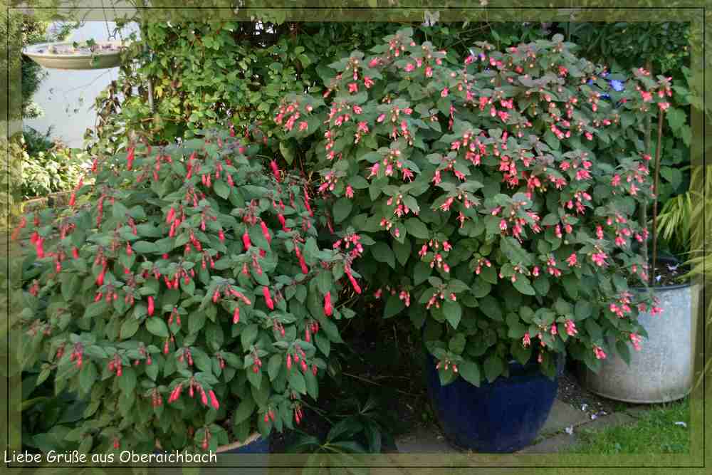 Hier einige meiner Fuchsien. Die unbekannte rosane im Vordergrund bekam ich vorletztes Jahr in unserem Blumenlädchen geschenkt. Sie sei zu mickrig, um sie noch verkaufen zu können. Sie hat es mir bis jetzt mit üppiger Blüte gedankt. Die hohe Fuchsie im Hintergrund ist eine Fuchsia paniculata. Die habe ich auch schon seit einigen Jahren.