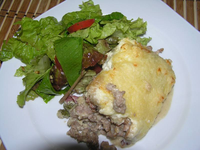 (hackfleisch, speck, kochschinken, spargel, semmelknödel und 1kg käse drüber...ich habs alles irgendwie einzeln gegessen, dann war es garnicht so übel