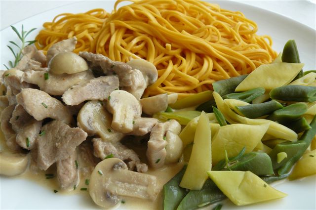 bei mir gab es:TomatensalatGeschnetzeltes, Bohnen und Safrannudenln