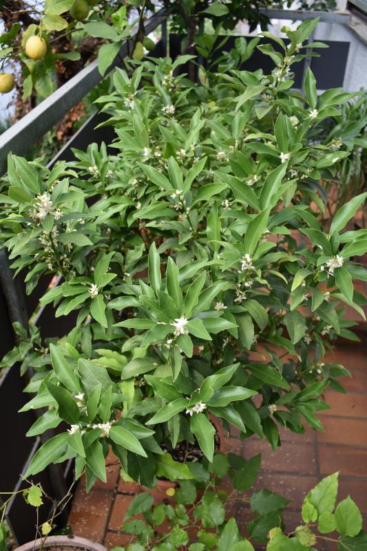 Darüber freue ich mich und gebe bei der Gelegenheit immer mal wieder Flüssigdünger. Nix Winterruhe - im Süden bei Sonne wird's auch warm. Bisher sind die Blätter freudig grün und es hängen schöne Zitronen dran, die sich langsam umfärben. Die Zitrone hat auch viele Knospen und ab und zu duftet die ganze Veranda, wenn eine Blüte aufgeht.