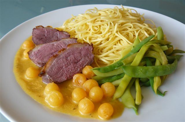 es gab:Entenbrust auf einer Kürbissauce, Bohnen, Nudelnsüss gefüllte Tomaten aus dem Ofen Ente Barbarie, männlich, Frankreich, Kürbis Small Sugar, Stangenbohnen Mango, Goldmarie, Terli, Tomate Silbertanne