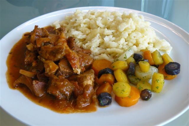 es gab:BlattsalatRindsvoressen (Ragout) mit frischen Steinpilzen und Pfifferlinge, Spätzli, bunte Karotten