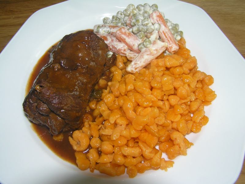hier mein bildnachtrag von gestern. reste aus dem tk. rouladen, tomatenspätzle und erbsen-möhren (aus der dose