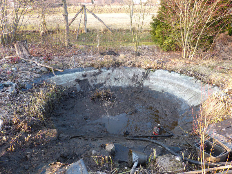 Meinen Teich putze ich jedes 3. oder 4. Jahr. Das mache ich allerdings im Herbst an einem sonnigen, warmen Wochenende. Ich schöpfe das Wasser dann durch ein Sieb, um alle Lebewesen einzufangen, die setze ich dann in gesonderte Kübel damit ich sie später wieder dem Teich zurückgeben kann.