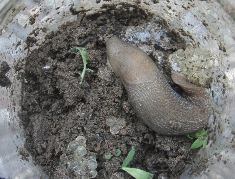 Nun habe ich eine Schnecke samt Gelege gefunden (Eier durchsichtig), die ich nicht benennen kann. So geformt und so groß wie eine Rote oder Spanische Wegschnecke, vielleicht bisschen dicker. Die Farbe aber dunkel-sandfarben bis hellbraun, keinerlei Zeichnung.