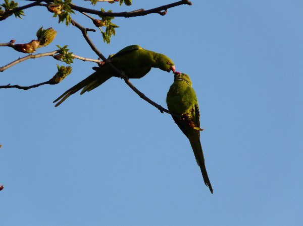 Hier ein Bild aus dem letzten Frühjahr, schnäbelnde Halsbandsittiche in einem Garten im Rheinland, links das Männchen.Eckhard