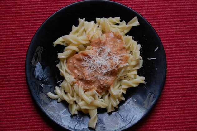 Zu den heutigen Fusilli gab es eine Soße aus gehacktem Knobi, geriebenen Zucchinis, passierten Tomaten und etwas Sahne und Frischkäse; obendrüber Parmesan. Trotzdem wollte ein Kind (immer das Gleiche ::) ) beim Nachschlag lieber nackige Nudeln haben :P ;) .