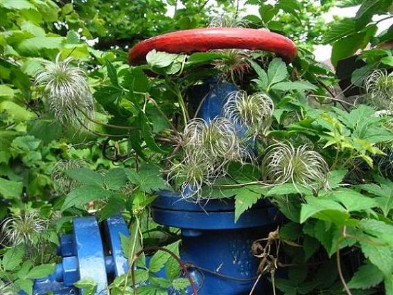 Sieht interessant aus. Was ist das so sorgfältig rot und blau Gestrichene, was die Clematis wild umgarnt? Sieht aus wie ein großer Absperrhahn...Mal ein Detail aus meinem Garten: