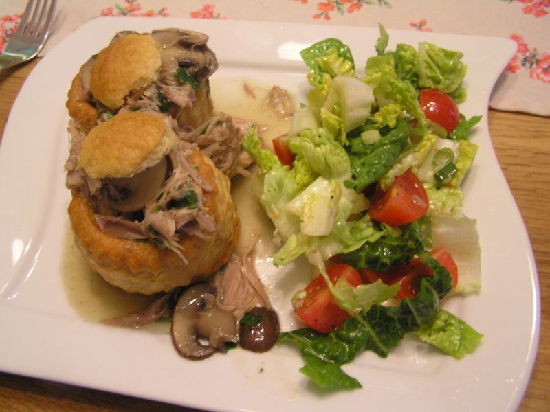 und heute gabs:königinpasteten gefüllt mit einem ragout aus kaninchenfleisch und champignons, dazu salat mit cocktailtomatenvierteln
