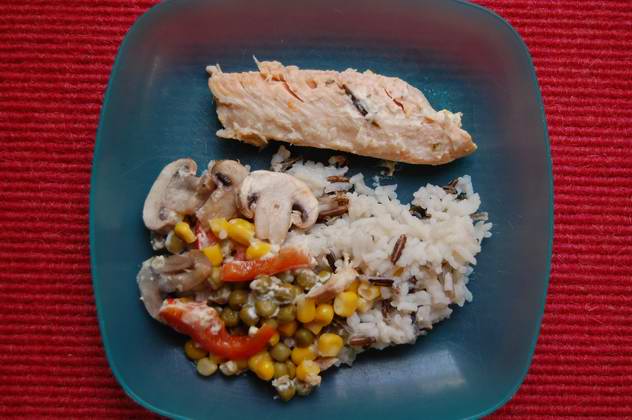 .Saiblinge aus dem Werbellinsee (mit Salbei, Rosmarin und Knobi gefüllt im Backofen gedünstet), dazu Basmati- und Naturreis und kunterbuntes Gemüse