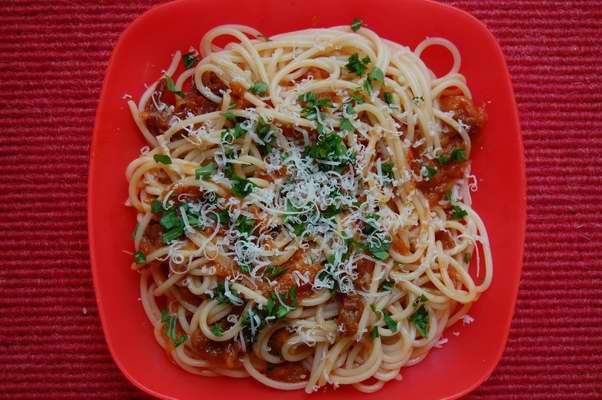 .Heute gab es Spaghetti mit Zucchini(gerieben)-Tomaten-Curry-Soße, Parmesan und gehacktem Ruccola.
