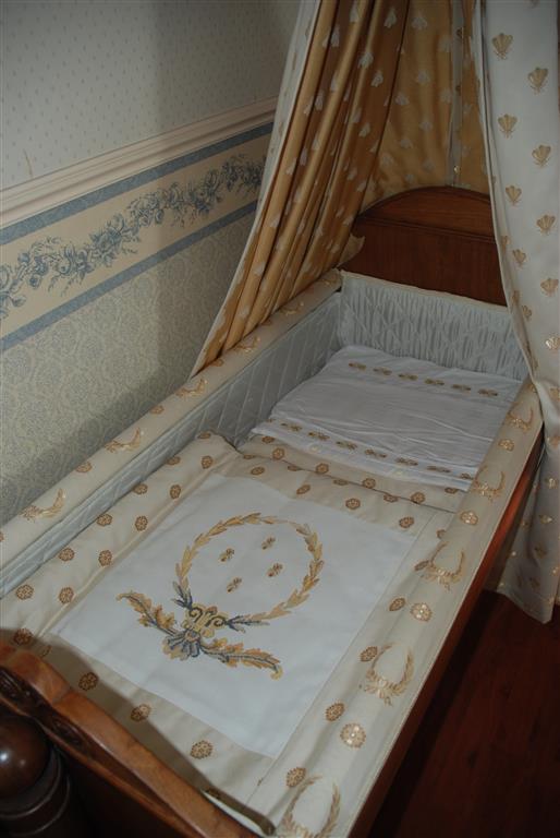 . Es ist eine sogenannte Tonnenwiege mit langem Schwanenhals. Glücklicherweise bekam ich zur Bekleidung die "napoleonischen" Stoffe. Das Wappen habe ich etwas farblich abgeändert. So sympatisch war mir dann der kleine Corse dann doch nicht.......
