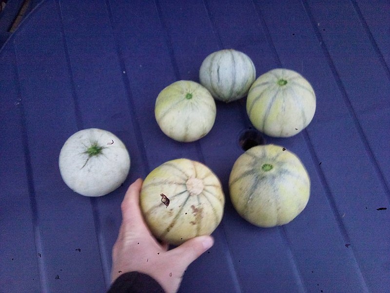 Aus dem Gewächshaus hab ich letzte Woche zwei geerntet, super Aroma, Zucker hätt noch ein bischen sein können. Zwei kommen sicher noch nach, eher klein, ca. 8cm im Durchmesser.