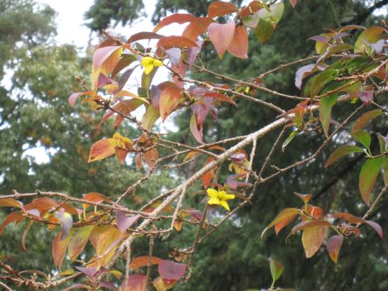 Alle Jahre wieder entschädigt sie mich damit für ihren allzu lauten Auftritt im Frühjahr.Deshalb darf sie auch bleiben. Als einzig übrige Vertreterin ihrer Art in meinem Garten. Unsere Forsythie. Inzwischen flankiert von Calycanthus floridus 'Athens' einerseits und der Rose 'Graham Thomas' andererseits. Unterpflanzt von so allerlei.O.K. Sie ist kein Baum und wird auch keiner.
