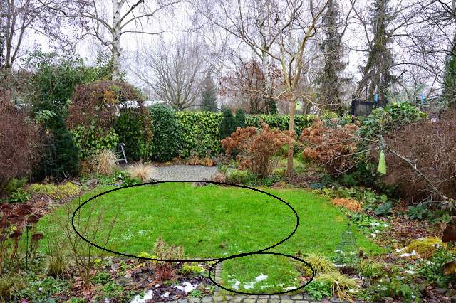 . Und das zu allen Jahreszeiten, soweit ich mich erinnern kann. Wenn du diese Mitte wegnehmen würdest, bräuchtest du ein komplett neues Konzept. Neue Pflanzfläche könntest du aber eventuell dadurch gewinnen, indem du aus dem Rasenquadrat einen Kreis machst, der quasi als Verbindung zwischen der vorderen Pflasterung, die Terrasse nehme ich an, die auch eher rund ist und der hinteren Pflasterfläche liegt. So ungefähr, hab mir dein Bild mal geborgt und ein bisschen rumgemalt