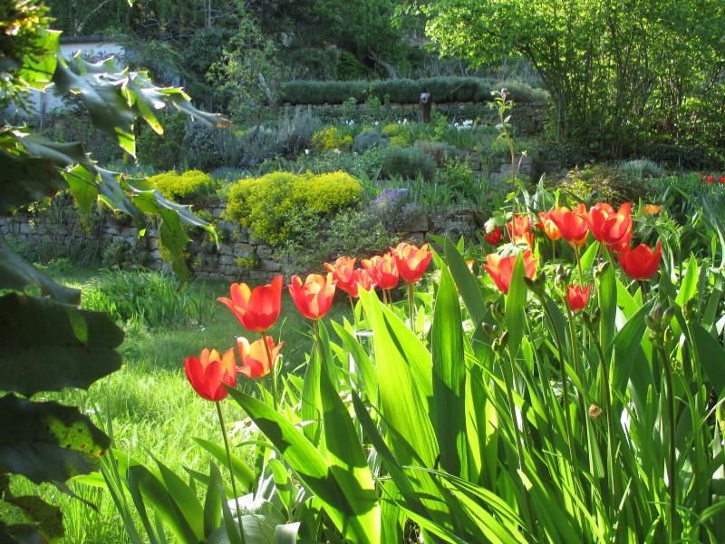 Mir gefällt es sehr, wenn abends ab 17:00 die Tulpen im Staudenbeet aufleuchten, das Alyssum saxtile steigert den Eindruck.