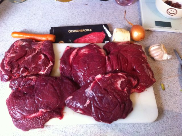 Schweinebäckchen, Kalbsbäckchen, Ochsenbäckchen bekomme ich hier auf Vorbestellung beim Metzger. Spontan habe ich aber bei Rewe Ochsenbäckchen mitgenommen, die nun im Ofen schmoren. :D