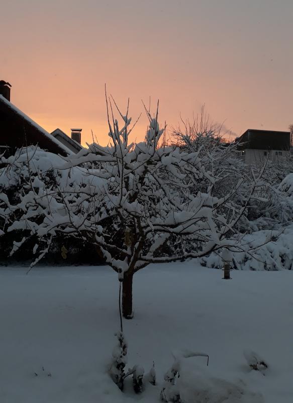 -1,4°, ca. 20cm Schnee liegt im Garten. Nun drückt die Sonne etwas durch.