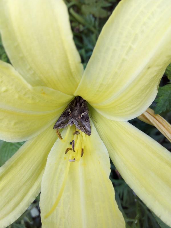 Ich habe mich immer gewundert, was wohl die Taglilien bestäubt. Die Narbe guckt ja meist sehr weit raus und Bienen und Hummeln sehe ich da kaum dran. Gestern habe ich den heimlichen Helfer vielleicht erwischt, die allgegenwärtige Gammaeule.