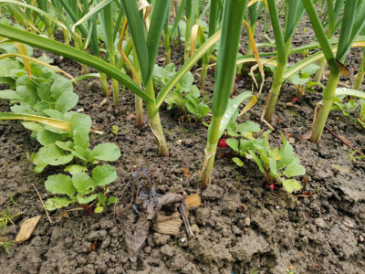 Ich habe den Knoblauch dieses Jahr mit Radieschen zwischen den Reihen.