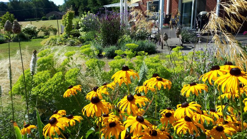 Allen Unkenrufen zum Trotz gedeihen hier noch Rudbekia 'Goldsturm' und Helenium 'Kanaria?' 8) Mit ihrem Goldgelb peppen sie die in der Sonne wie ausgewaschen wirkende Szenerie ganz wesentlich auf und bekommen ab und zu dafür ganz gezielt mal etwas Wasser mit.