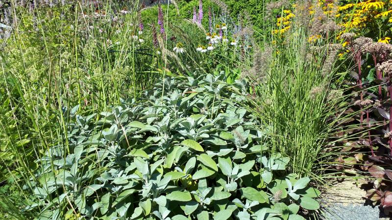 Salvia 'Berghimmel' blüht so gut wie gar nicht, macht aber ganz wunderbar mit großen silbernen Blättern in der prallen Sonne mit. 8)