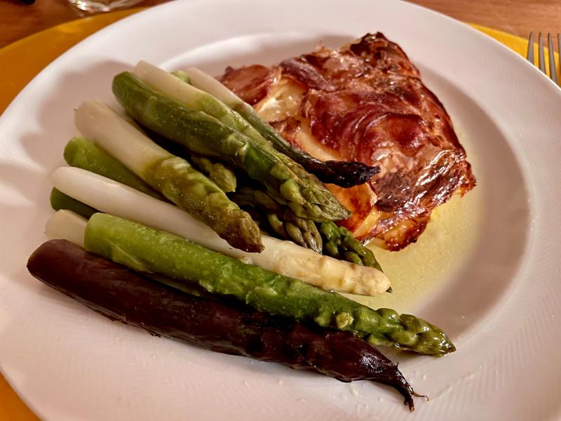 und weil es gerade so interessant diskutiert wurde: dieses foto von kartoffelgratin und gartenspargel aus dem backschlauch habe ich sofort nach dem auftun im küchenbereich bei hellem küchenlicht gemacht, das würde ich eher vorzeigen…