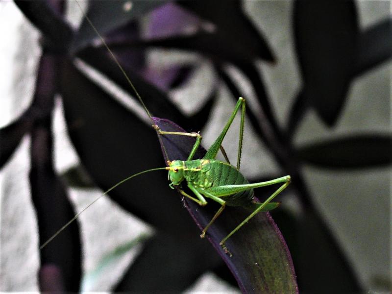 Die weibliche Punktierte Zartschrecke hat es bis auf den Balkon geschafft.