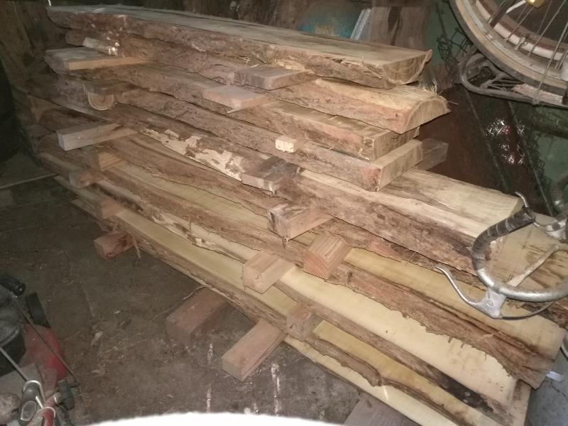nach meinem Gefühl braucht das nicht noch Gurte, oder doch? Die Bretter sind 5 cm dick und so schwer dass ich die 2,10 m langen kaum allein bewegen kann. Die oberen sind ca. 1,40 m lang. Der Sägewerker hat die Schnitte sehr gut gesetzt, auch die Außenbretter sind noch sehr gut zu nutzen.