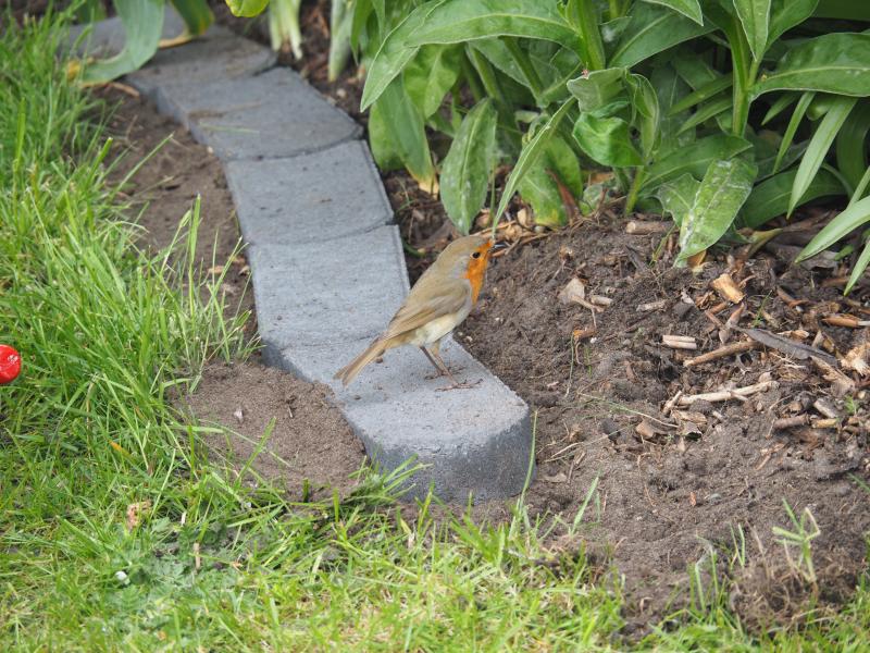 Unser Rotkehlchen heißt hier nur noch Kamikaze. Es zutraulich zu nennen, wäre eine heftige Untertreibung. Sobald jemand mit einer Schaufel in Sicht ist, kommt er angeflogen und guckt erwartungsvoll. Beim Kompostsieben springt er in die Grube und unter das Sieb, nicht einmal die Stemmarbeiten mit dem 18 kg Abbruchhammer haben den Kollegen beeindruckt. Der Blick wird halt nur vorwurfsvoller, weil keine Würmchen zu finden sind.