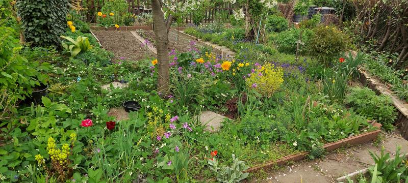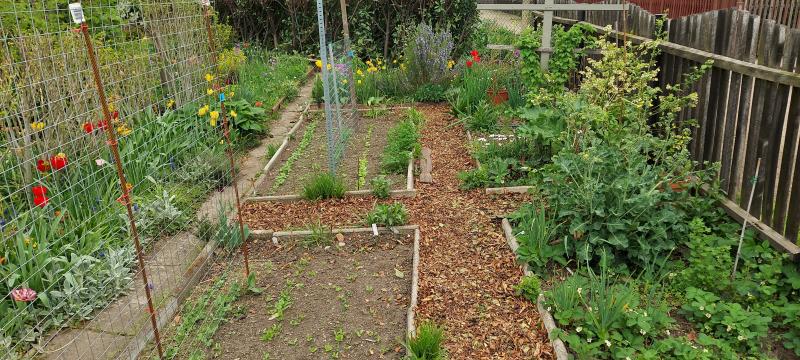 Hier sind die Gemüse Beete (wo aber immer mehr Obst einzug hält), von links die Hibiscus Hecke und davor die kunterbunte Tulpenstreifen.
