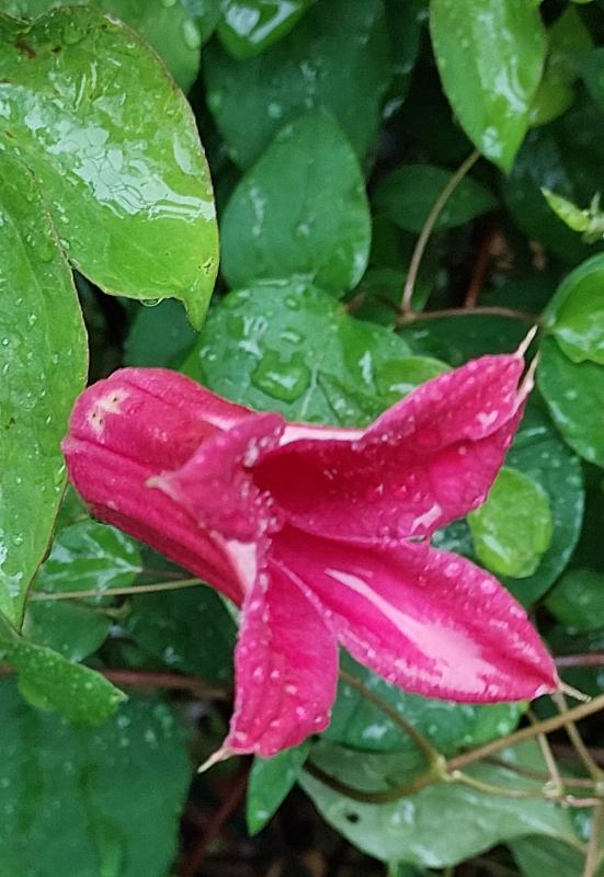 Immer wieder schön, Clematis texensis Princess Diana. Obwohl sie leider im Wasser steht. Starker Dauerregen, wir haben für den hinteren, tieferen Teil des Gartens Land unter.