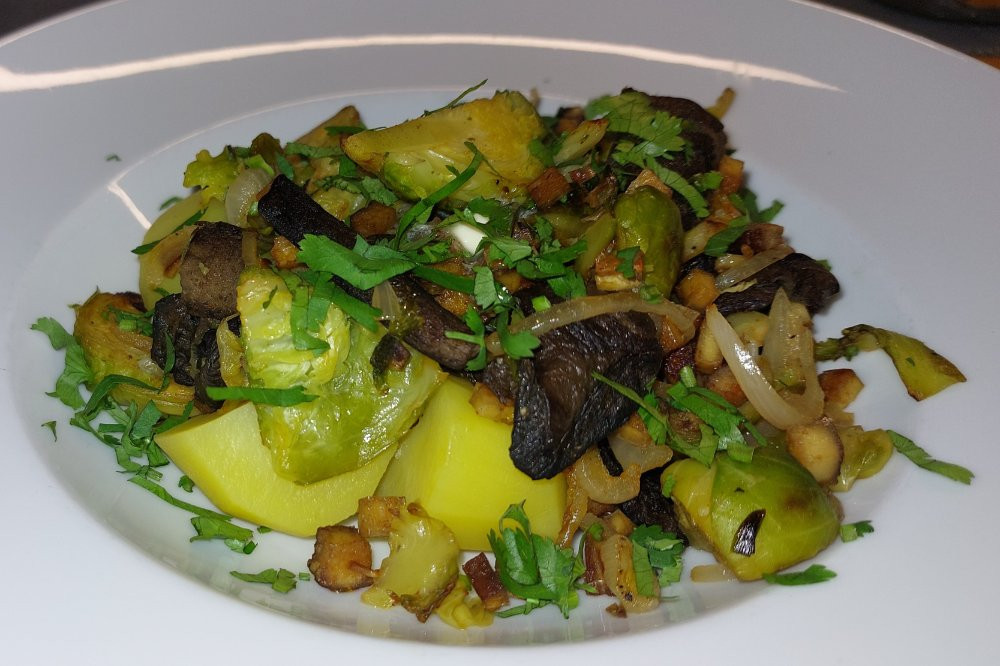 Rosenkohl mit Rotkappen und Zwiebeln gebraten auf Salzkartoffeln,