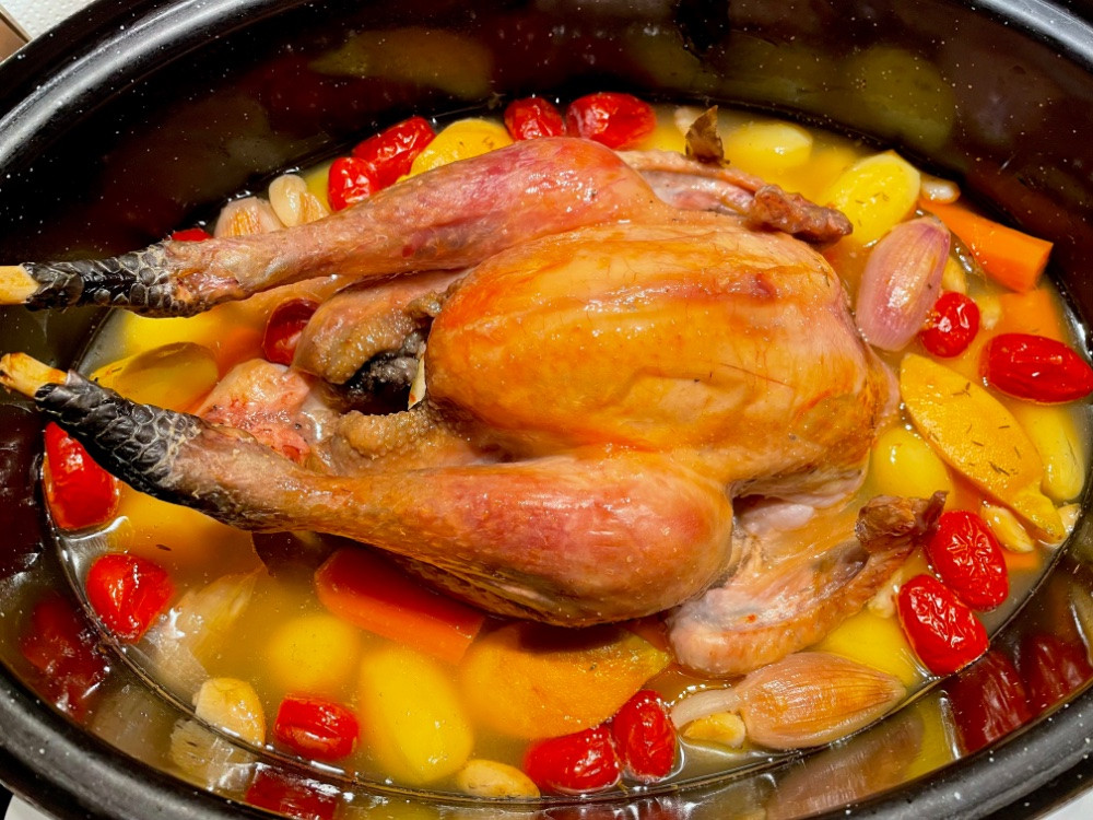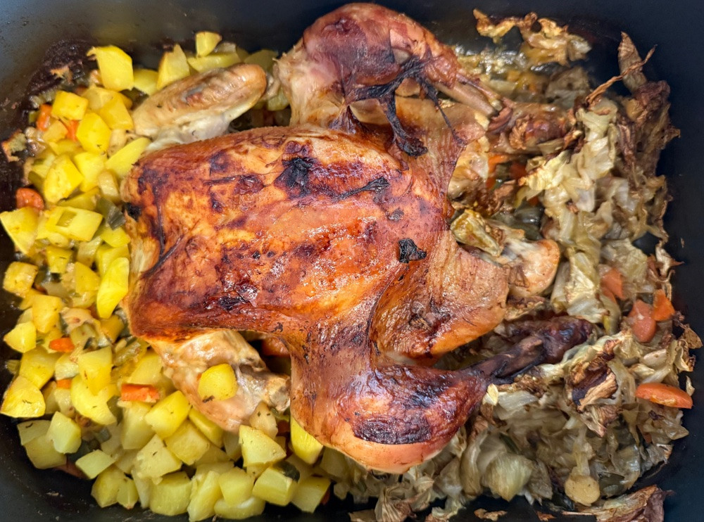 bei uns ganz unspektakulär französisches schwarzfederhuhn aus dem ofen, hier eine weile vor dem fertigwerden dokumentiert.