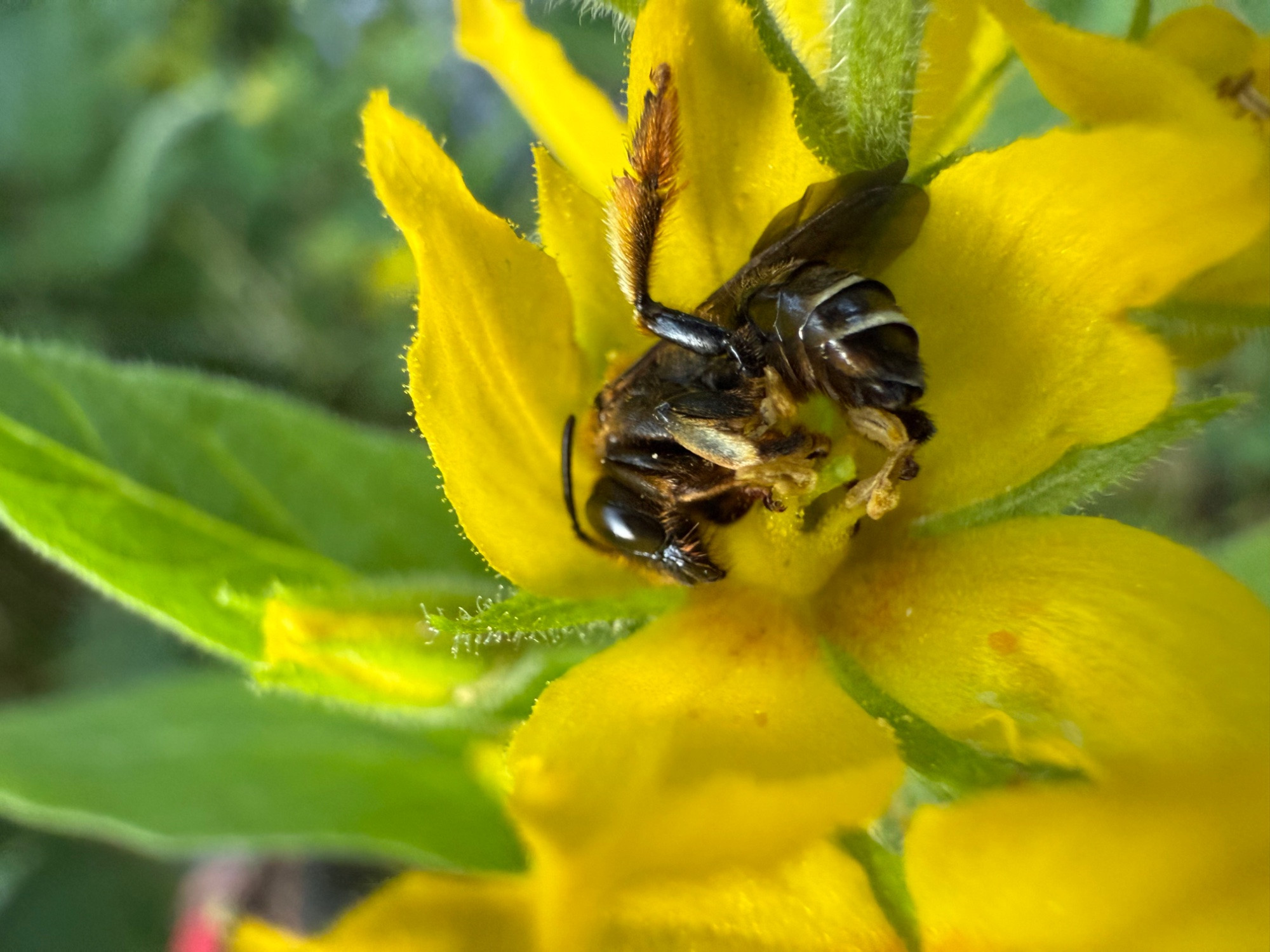 Hier mal eine spezialisierte, aber nicht seltene, Wildbiene: Sie gehört zu Macropis, den Schenkelbienen, die sich auf Öl statt Nektar spezialisiert haben und daher in Europa vor allem auf Lysimachia-Arten (Gilbweiderich) spezialisiert sind.