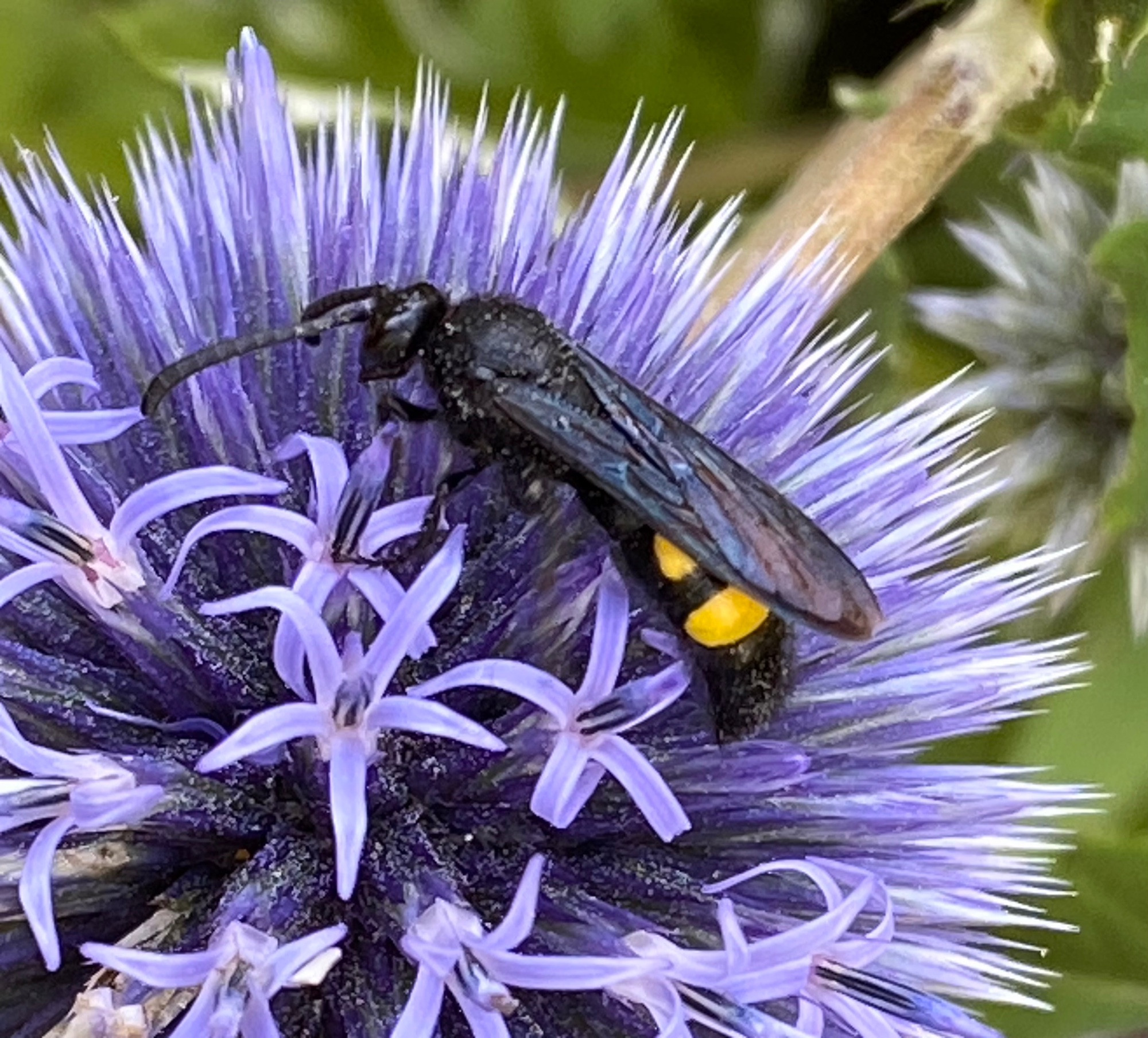 Hier tummeln sich zahlreiche Wespen auf den Kugeldisteln, ich denke es ist die borstige Dolchwespe (scolia hirta).