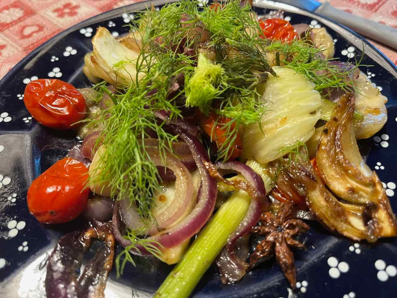 Italienisch Fenchel und Cocktailtomaten mit Olivenöl und Butter gebraten, mit Zwiebeln, Knoblauch, Sternanis und Kräutern gewürzt und mit Gemüsebrühe und Weißwein abgelöscht sowie Rosmarinkartoffeln zum Grünen Veltliner 2022 "Kaisergarten" aus dem Burgenland