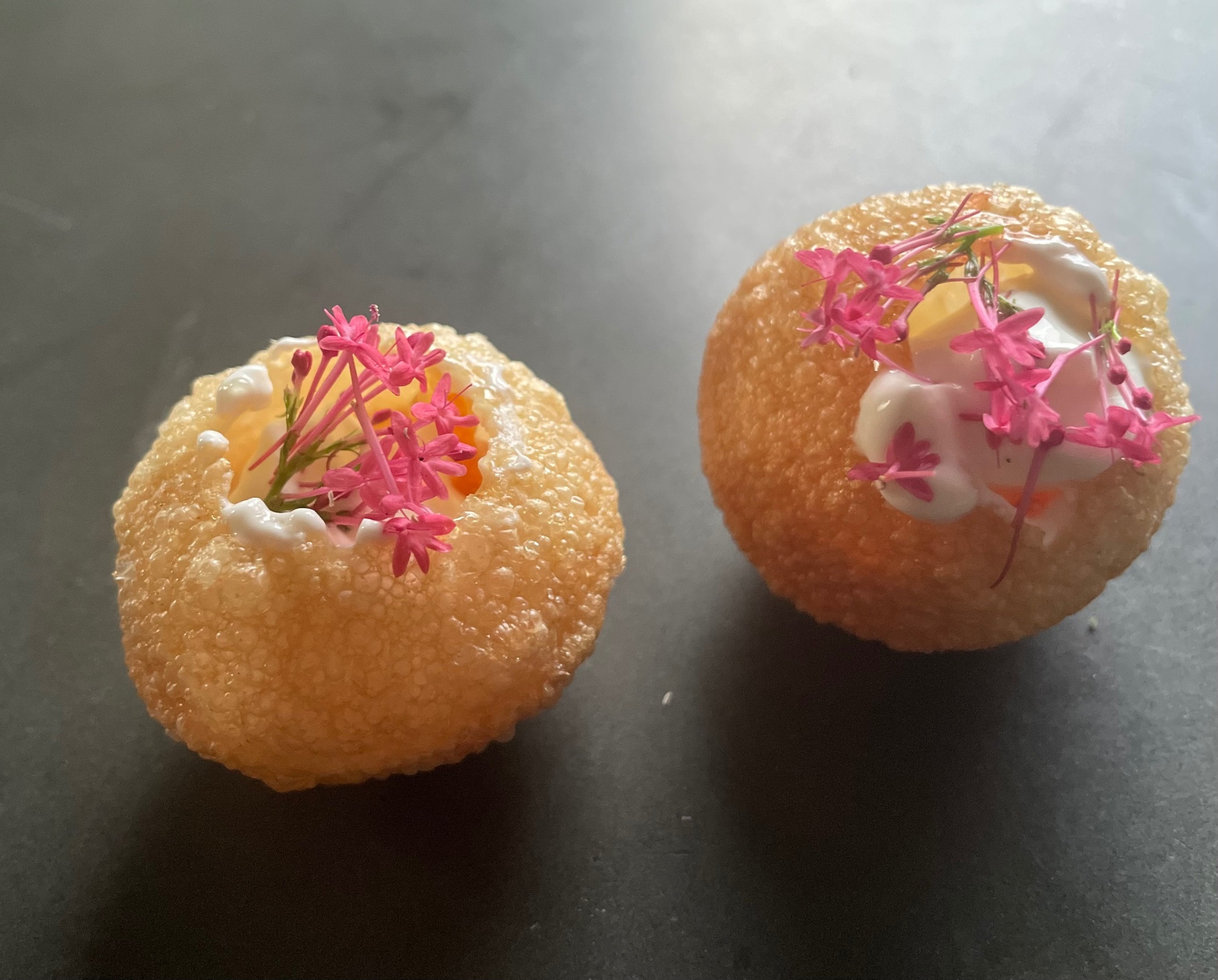 Die wunderbaren krossen Kugeln kann man auch süß befüllen. Wir haben es gerade ausprobiert mit Joghurt und Orangenmarmelade.