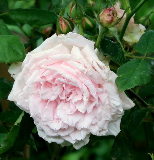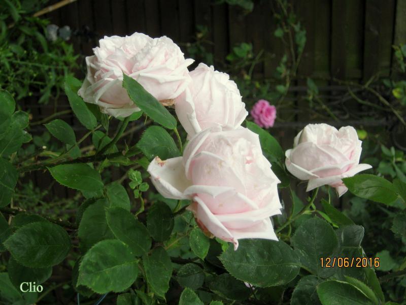 Hier die zweite meiner Remontantrosen, Clio von 1897, sie hat einen aufrechten Wuchs, der Duft ist zart. Die Blüte ist ballförmig in einem hellen rosa, die Blüten hängen leicht über.
