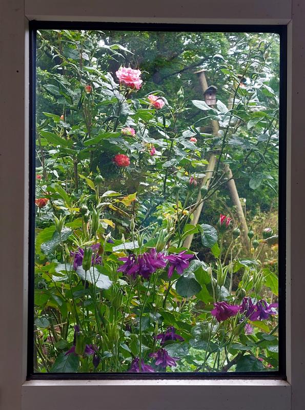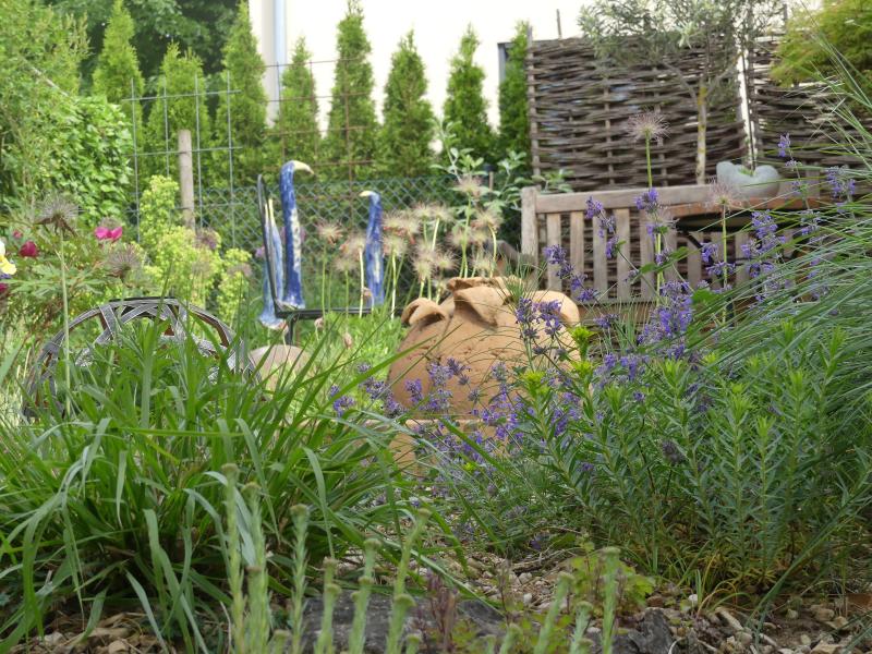 Hier der Blick aus meinem Dachfenster in den Vorgarten, ziemlich schmal beschnitten, weil Dach und Straße jetzt nicht wirklich sehenswert sind, daher am besten Draufklicken zum Vergrößern. Es ist eindeutig die Stunde des Zierlauchs, nachdem die Akeleien so langsam verblühen und die Frühsommerblüher wie Taglilien und Spornblumen sowie die polsterförmigen Sedums so langsam loslegen...
