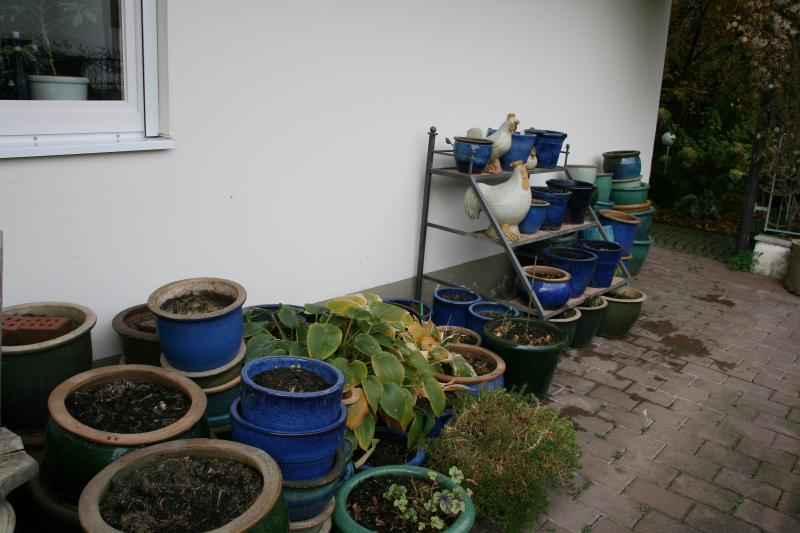 Nein, das ist z.T. Erde von den einjährigen, die nehme ich immer für ganz unten her, dann brauche ich nicht soviel neue Blumenerde. Im Vordergrund sind die Töpfe, wo ich meine Tomaten drinnen hatte. Das ist die Ostseite vom Haus, drüber ist ein Balkon, da stehen im Sommer immer meine Tomaten. Im Winter dann die Töpfe und die Hostas, da kann es nicht reinregnen. Sonst zerspringen mir meine schönen Töpfe. Die kleinen Hostas stehen auf dem Regal, die großen daneben. Die Hostas im Regal stehen dann im Sommer auf der Nordseite vom Haus, siehe Bild.