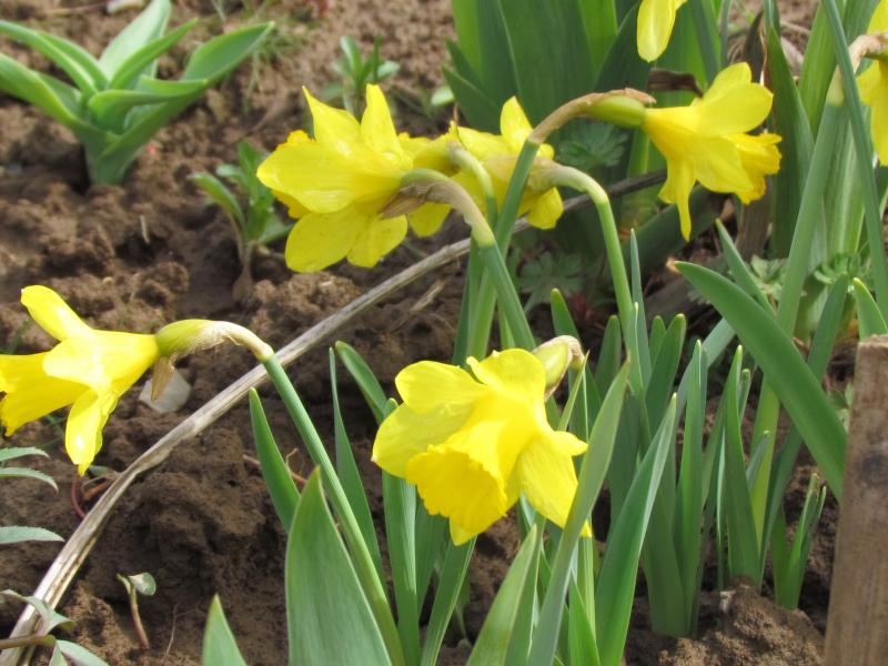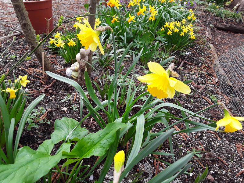 Meine Eltern und Großeltern hatten ihrerzeit "endlos" viele Narzissen in wenigen großblumigen Sorten zum Schnitt. Die wuchsen auf verschiedene Grundstücke verteilt, auch in den Weinbergen neben den Reben, wodurch man unterschiedliche Blühzeitpunkte und damit länger was zum Verkaufen hatte. An die "Berge" von Stielen erinnere ich mich noch sehr gut, genauso an den Duft nicht beernteter Beete. Irgendwann lief das alles nicht mehr und allmählich verschwanden die Bestände, bis irgendwann mal gar nix mehr da war. Bis auf gelegentliche eher zufällig gepflanzte Tüten im Hausgarten. Weil das ja kein Zustand ist, habe ich vorletzten und vor allem letzten Herbst mal kreuz und quer durchs Sortiment eingekauft, um zu schauen was mir so gefällt. Oder eben nicht. Allmählich kommen die teils recht spät, zwischen den Iris versenkten Zwiebeln zur Blüte.