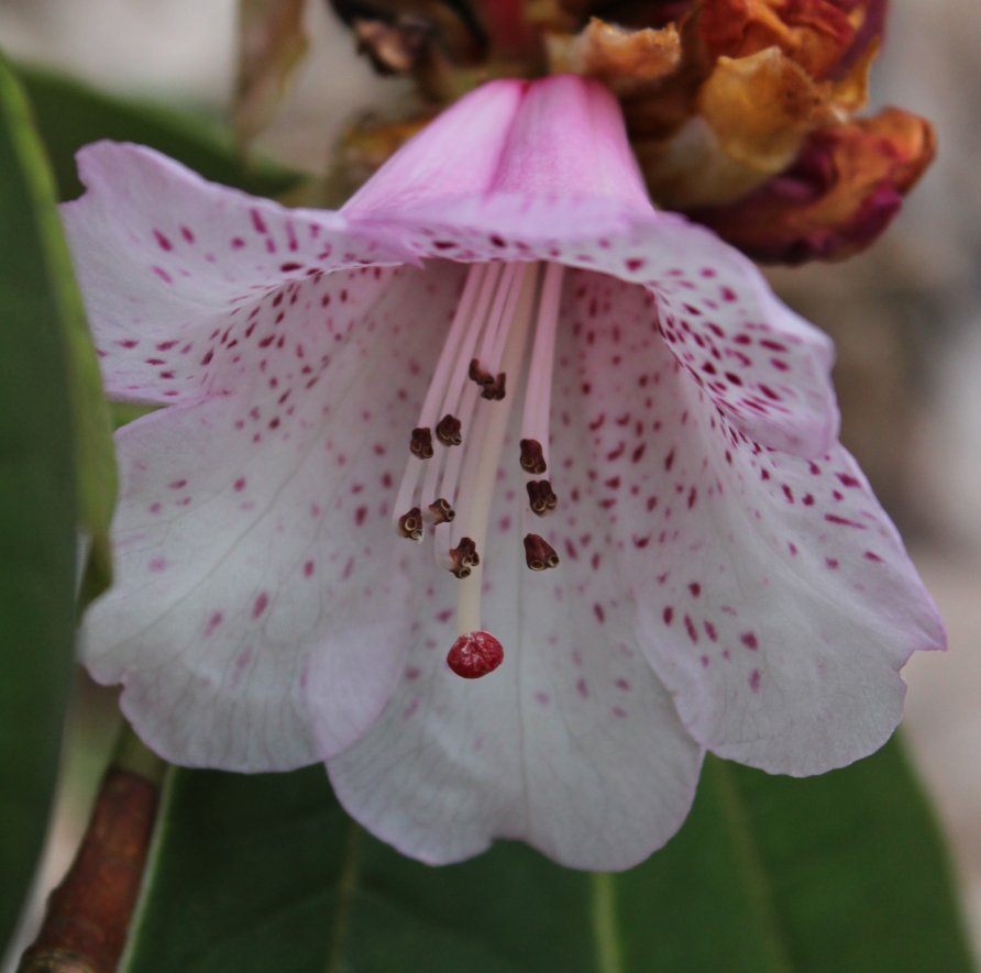 Falls es jemand interessiert: die Zeichen verdichten sich, dass es sich tatsächlich um 'Nimrod' handelt.Ich kenne nur wenige Rhododendron mit Sprenkel, die über sämtliche Kronblätter verteilt sind. Paradebeispiel ist ja Rh. irroratum 'Polka Dot'. Die für meine Lage frühe Blüte spricht eigentlich für 'Nimrod'. Die Blätter erinnern allerdings kaum an die Elternschaft von Rh. calophytum. Hat jemand eine Idee?