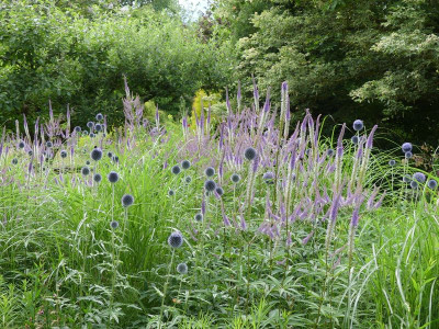 Im großen Herbstbeet bringt die Gelenkblume nun den Kontrast zu Veronicastrum und Echinops.