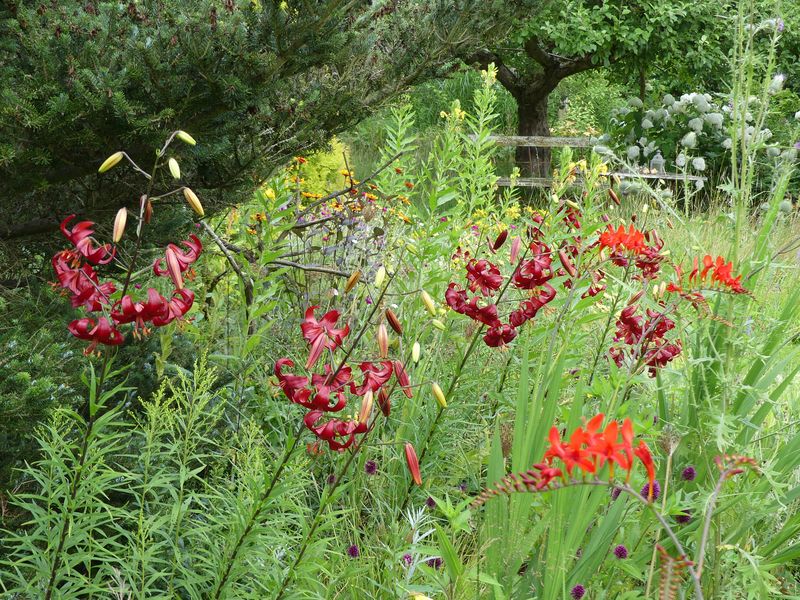 Auf dem Foto wirkt dieses Beet nun ziemlich bunt, in seiner Gesamtwirkung gefällt es mir aber ausgesprochen gut. Die Lilien sind im zweiten Jahr sehr gut wiedergekommen und haben auch den Spätfrösten getrotzt.