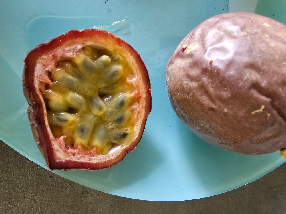 Nachtrag hierzu:Inachis hat geschrieben: ↑8. Jun 2024, 13:36 Ich weiß nicht so recht wohin mit meiner Frage, im Klettergarten hab ich schon ein altes Thema ausgebuddelt, aber da lesen vielleicht die Maracuja Kenner nicht mit?.Die als "essbare Maracuja" im letzten Sommer gekaufte Pflanze hat jetzt viele Früchte. Ich frage mich, wie ich erkenne, ob sie reif sind? Und werden die noch lilabraun außen? Ich dachte die gelben brauchen einen Bestäuber, aber ich habe nur eine Pflanze.