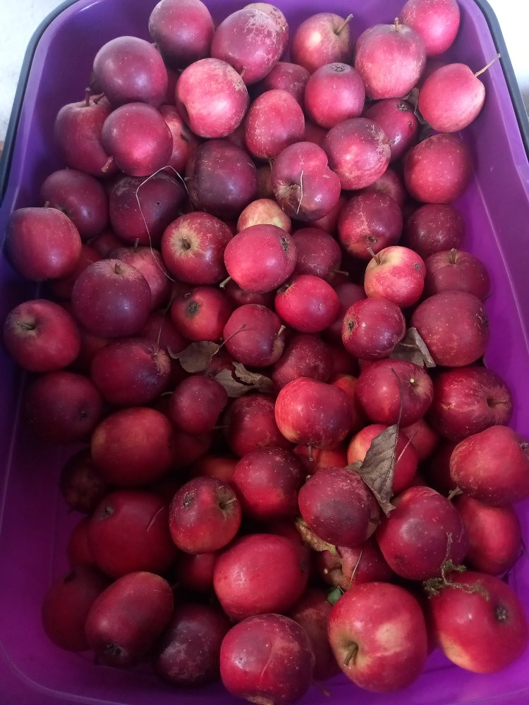 Gestern ein paar Falläpfel gesammelt. Wird noch mehr kommen. Es ist wahrscheinlich ein Purpurroter Cousinot. Daraus wird ein Wein gemacht.