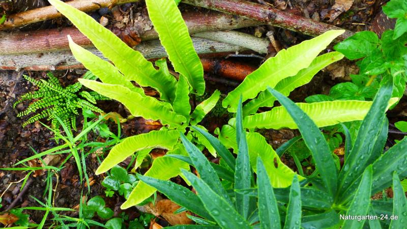 daneben kommt ein Hirschzungenfarn (Asplenium scolopendrium L.)