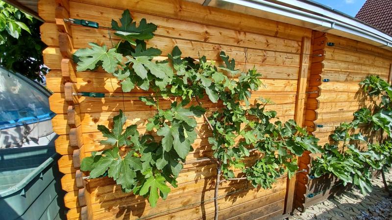 Longue d'Août am Westspalier macht sich gut im 3. Jahr. Eine Breba wird reifen und Herbstfeigen schauen auch gut aus. Viel Erziehungsarbeit, aber dafür nie Gießen. ;)