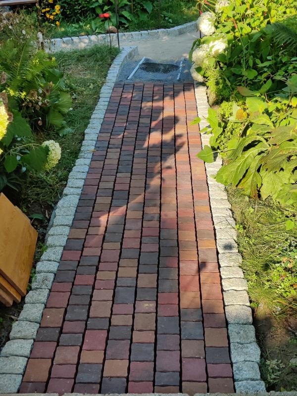 Nachdem diese Woche eine fehlerhafte Palette Pflastersteine ausgetauscht wurde und wir die Steine für die Ansätze zugeschnitten hatten, haben wir das erste Wegstück gestern eingesandet und abgerüttelt, um zu sehen, ob auch alles passt. Und das tut es. :) Petrus hat es gut gemeint und seit Freitag Abende ca. 38 Liter Regen hier abgeladen, also musste ich nicht gegen die Dürre anwässern und konnte weiter pflastern.